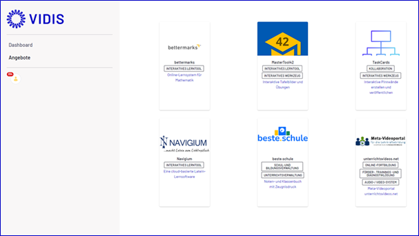 Kernbestandteil von VIDIS ist ein Anmeldedienst für Schulen mit angeschlossenem Katalog (VIDIS-Portal) für Anbieter von digitalen Bildungsangeboten.